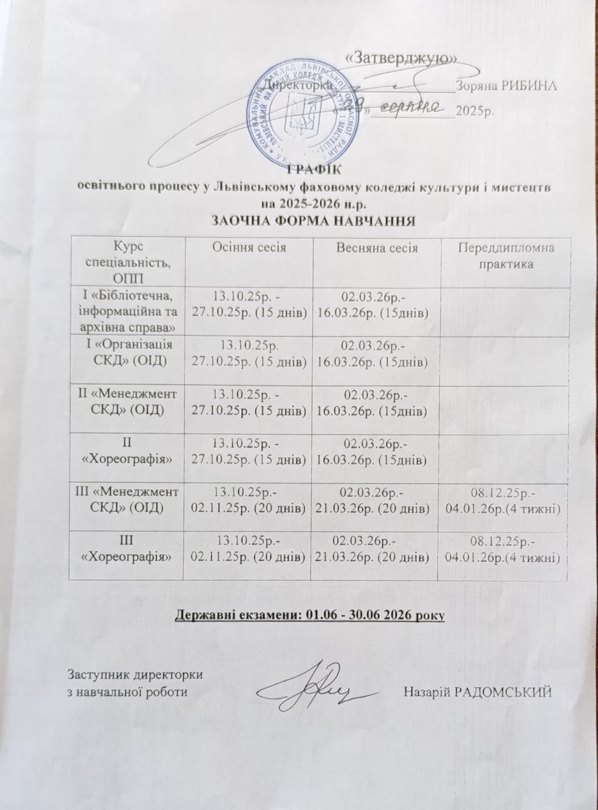 Розклад іспитової сесії для студентів заочної форми навчання (ВТЗ/Хореографія)